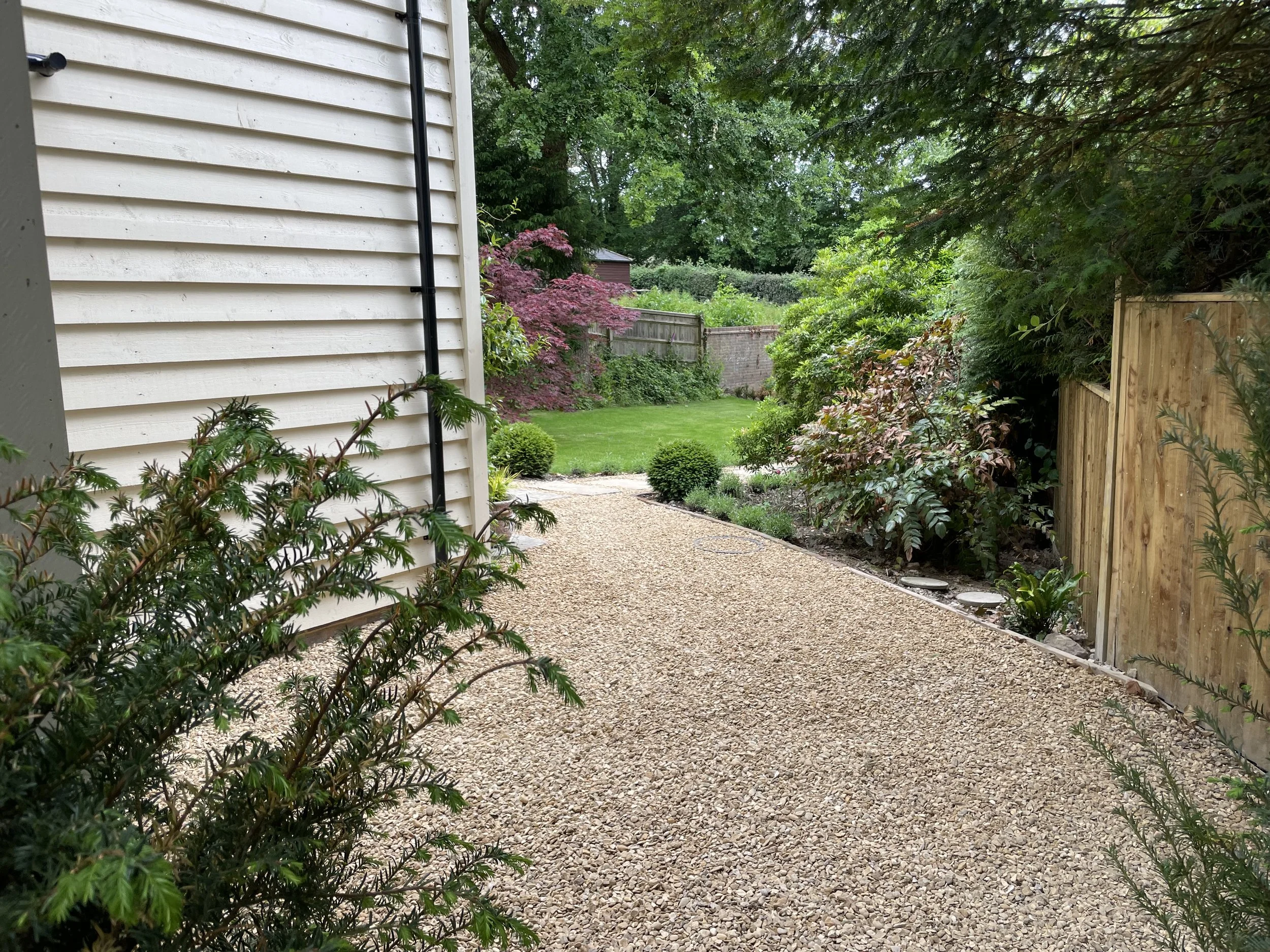 Where possible, the existing yew hedging was carefully lifted and repositioned to frame the pathway and define the newly formed planting beds. A statement Magnolia, underplanted with Hydrangea ‘Annabelle’, now creates a soft, elegant focal point at the entrance.