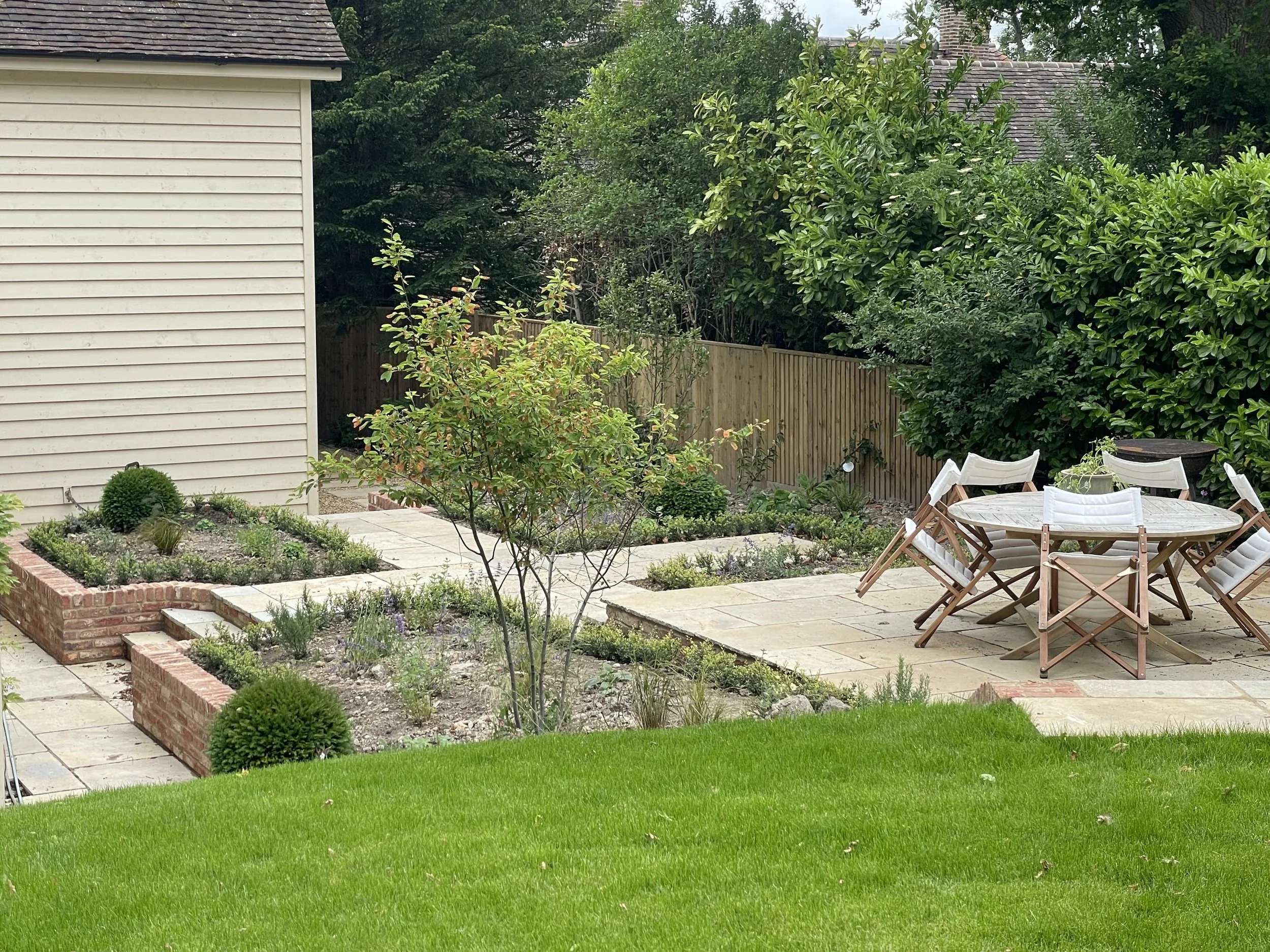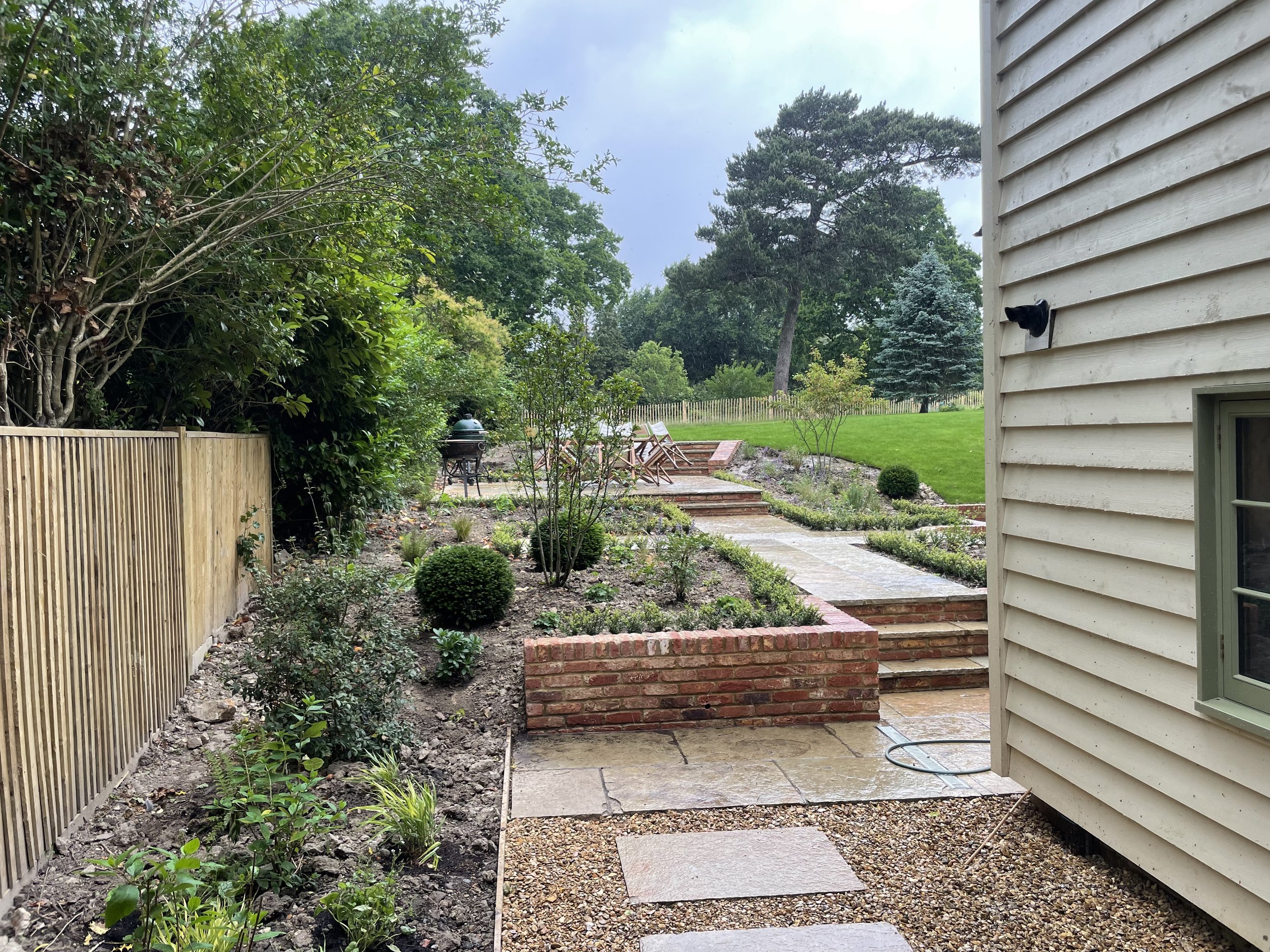 Nestled on the Kent–Sussex border, this newly extended family home required a garden design that matched its contemporary rural character while resolving the significant level changes across the plot. My clients wanted a harmonious outdoor space ready for summer—somewhere functional, beautiful, and seamlessly connected to the surrounding countryside.