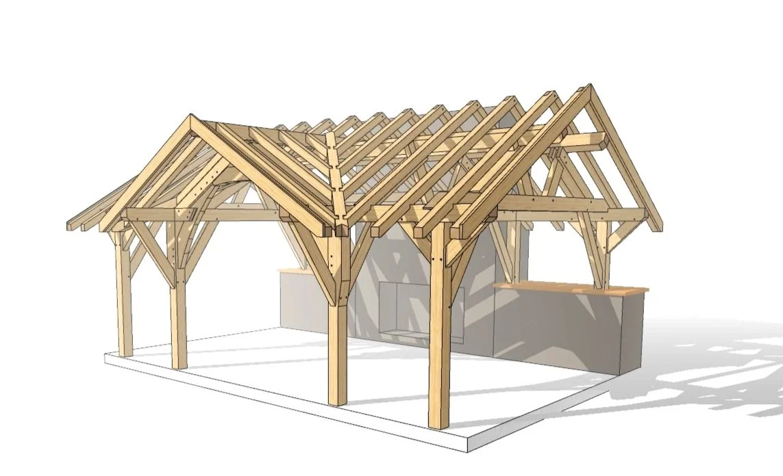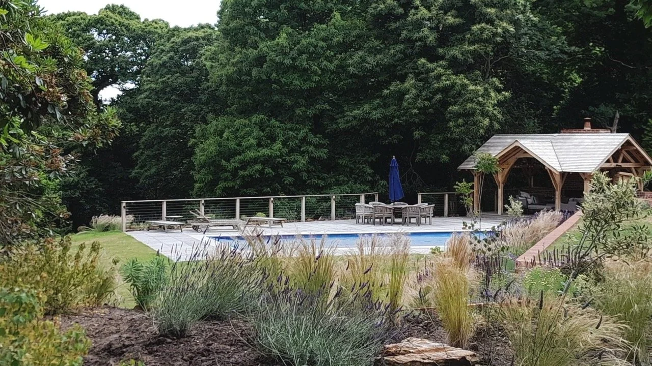 A new addition to the project is the oak-framed pool house. The use of oak framing adds warmth and character to the design, harmonising with the natural elements of the garden.