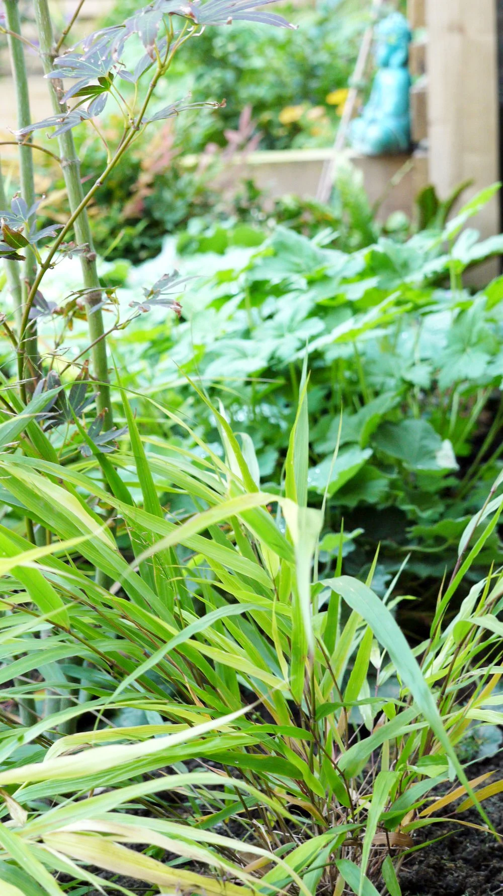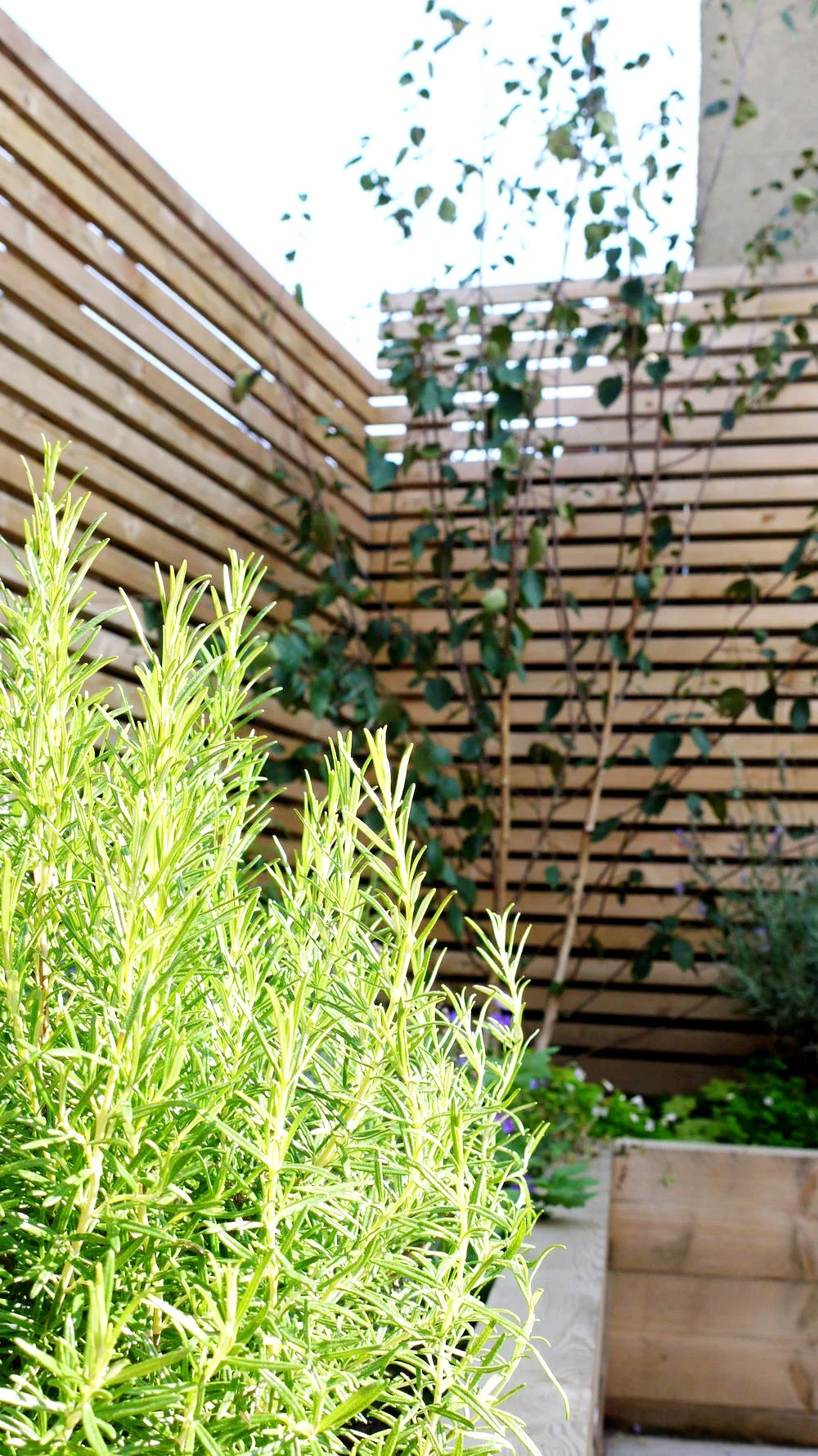 The design challenge lay in diverting attention away from the garden's existing aspects including the dominant presence of neighboring walls and the rooftops of three adjacent sheds.