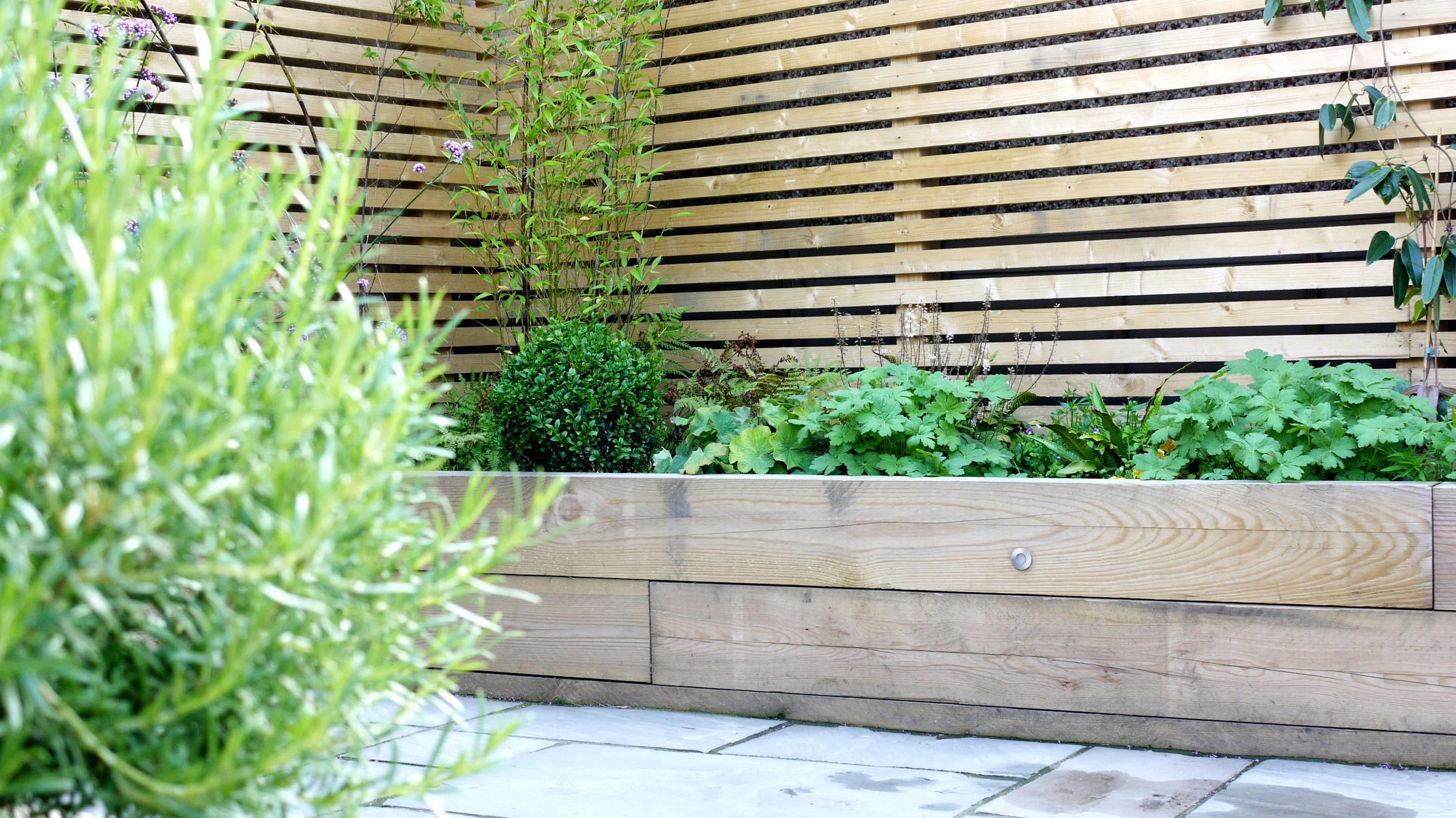 Wooden sleepers were used to create raised beds, sandstone paving was laid in random pattern and wooden batons were affixed horizontally, to provide trellis support for plants, as well as a striking feature wall.